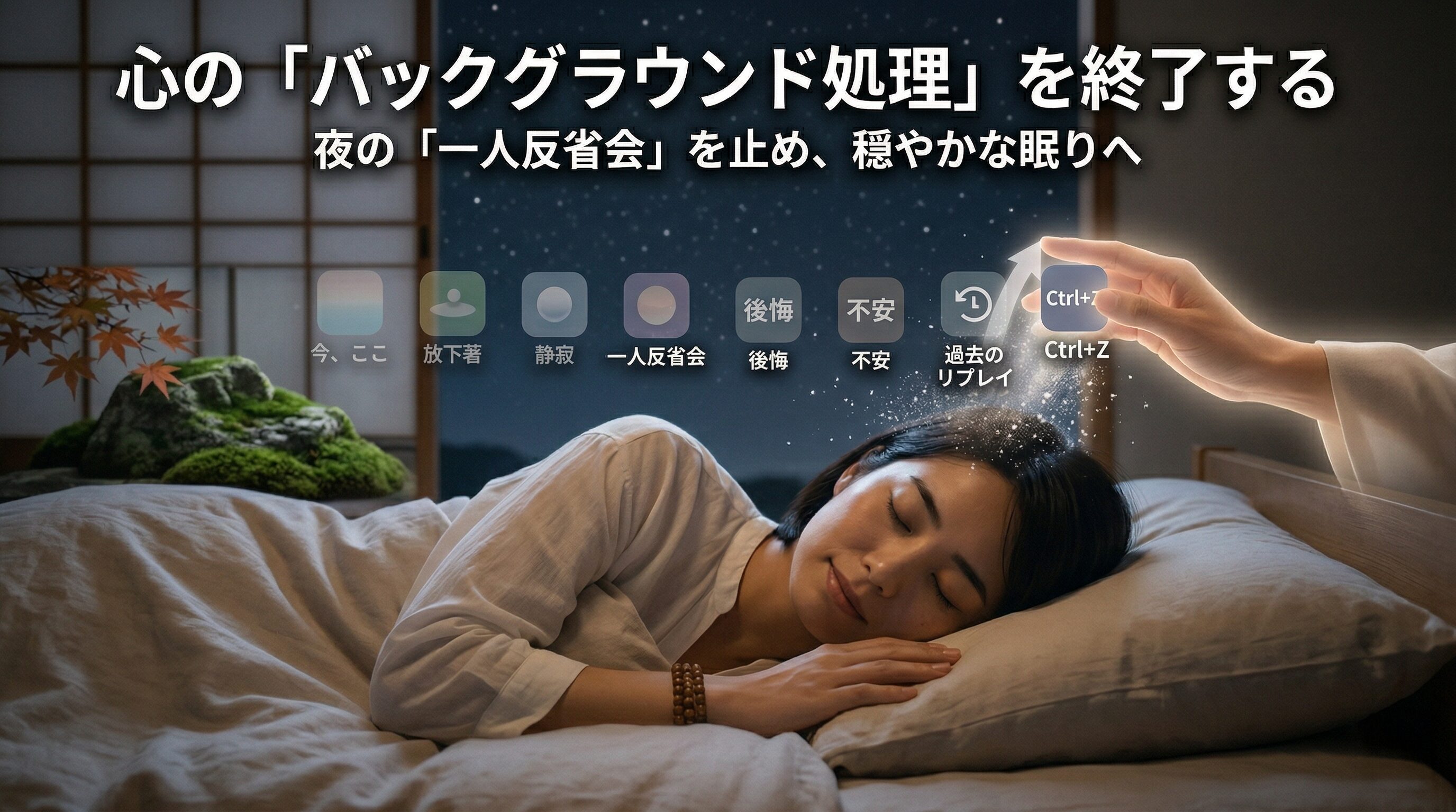 「さあ、寝よう」とベッドに入った瞬間。 静寂の中で、頭の中の「反省アプリ」が勝手に起動したことはありませんか? 「あの時の、あの言い方はマズかったかな…」「明日のプレゼン、失敗したらどうしよう…」 昼 ...